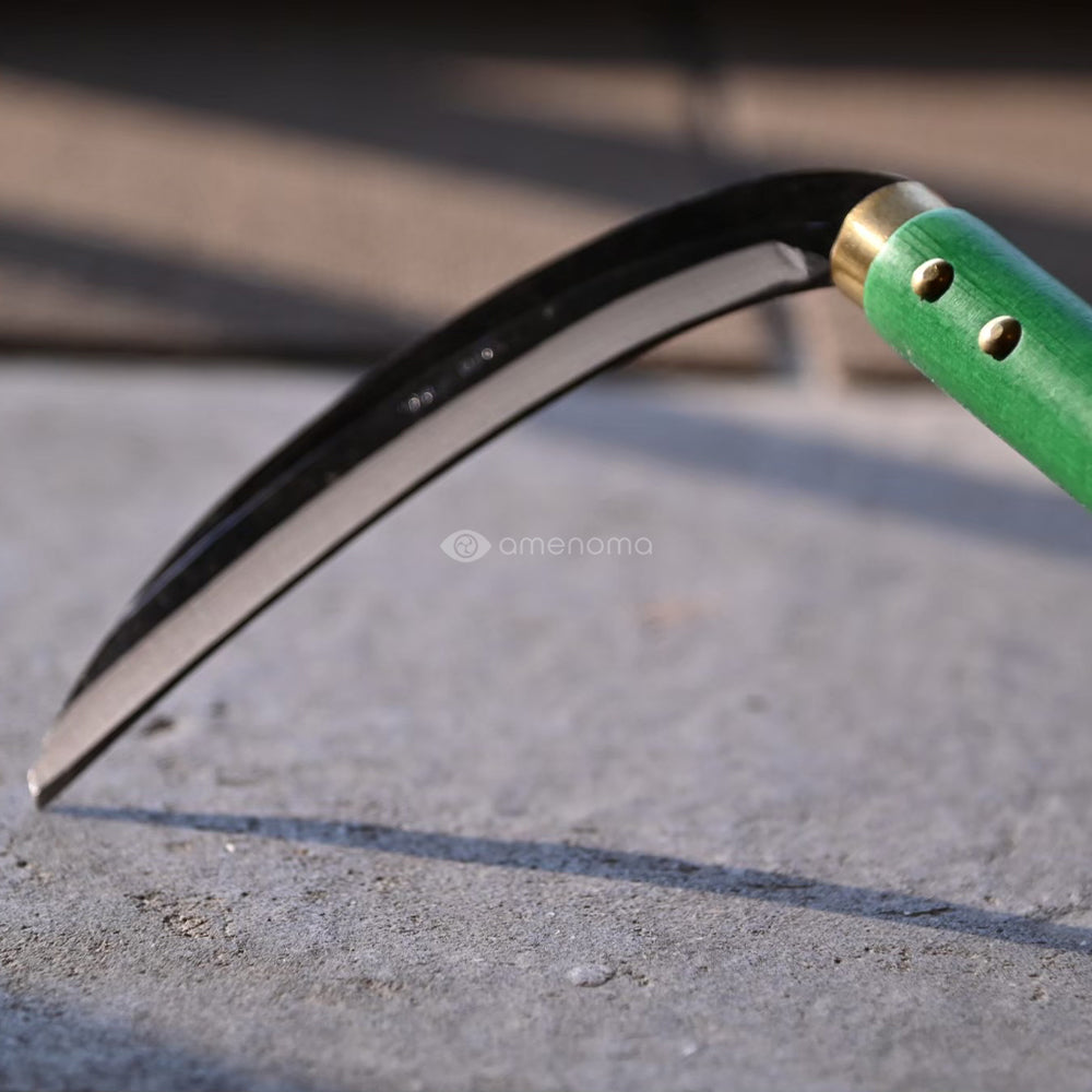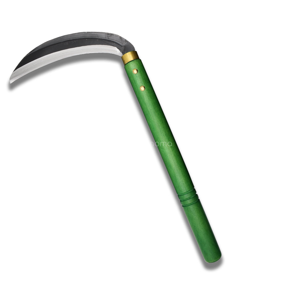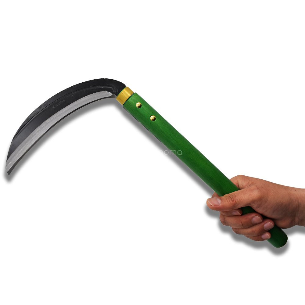 spring/summerはまさにカミソリの切れ味。 刃は1.6mm厚の薄い鋼付材をHRC60度以上の硬度で全身焼入れ、さらにスキ仕上(研磨した刃をさらに凹状に削る事により草離れが良く切れ味を向上させる技法)で薄くしました。片刃で切れ味最高、研ぎ直しも簡単最高な草刈鎌です。柄は緑色を採用。丈夫で耐久性重視で作りました。