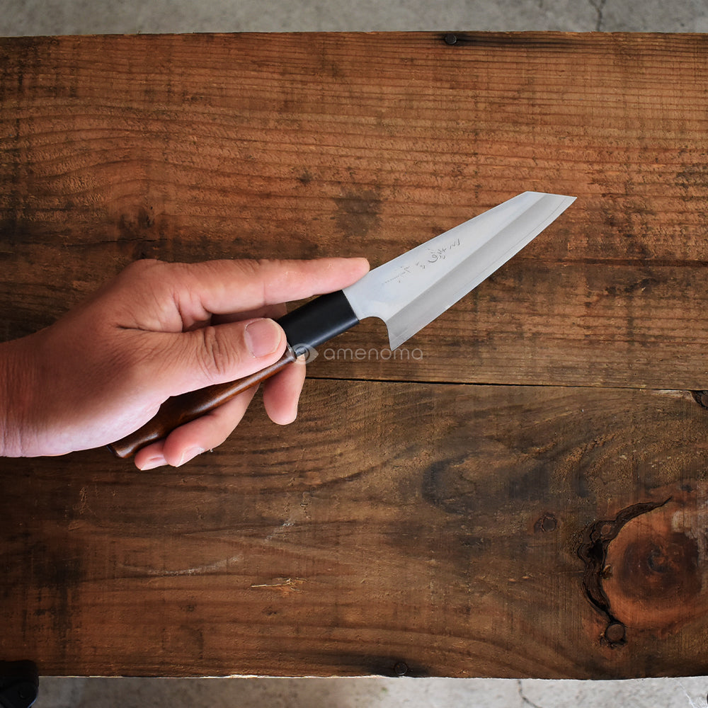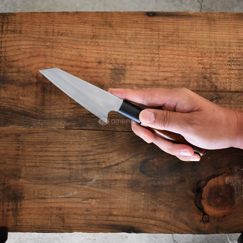 The now-rare brass ferrule has been revived in jet black, and the wooden part has been repeatedly coated with the traditional Japanese technique of "lacquer," resulting in a handle with antibacterial and waterproof properties. It is highly corrosion-resistant, and the rounded corners of the handle create a finish that is gentle on the palm of your hand. The blade is made of rust-resistant "V Gold No. 10 steel" 2mm thick, is easy to maintain, and has a thin, sharp cutting edge. The corner of the base of the blade can be used to carve out potato sprouts, making it a versatile knife. The small Sanjuzu type is a petty type.