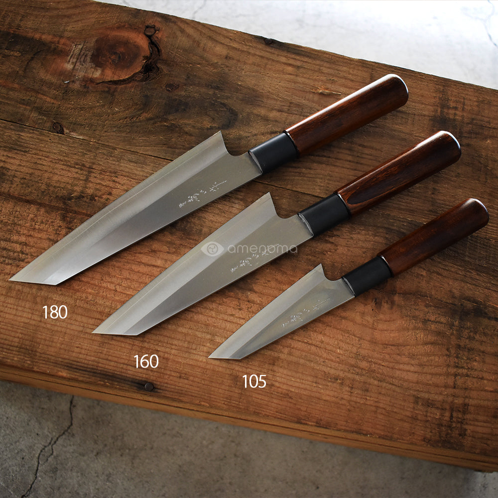 The brass handles began when Yamato Miyawaki III, the third-generation owner, was attracted to the modern look of old brass-handled knives brought in for sharpening, and wanted to recreate them. It's difficult to revive something that's gone, so after much trial and error, the brass handles were finally created. The Misuzu double-edged knife is also incredibly lightweight. It's a knife that cuts effortlessly and doesn't tire you out during daily cooking. The lacquer handle is antibacterial, making it fun and safe to use every day. Highly recommended for those who love Japanese-style cooking tools.
