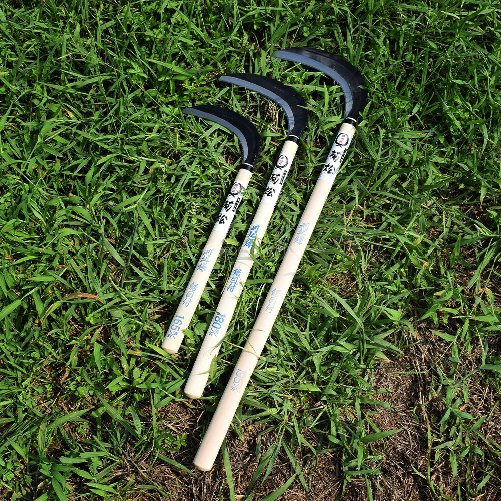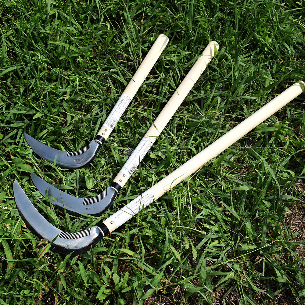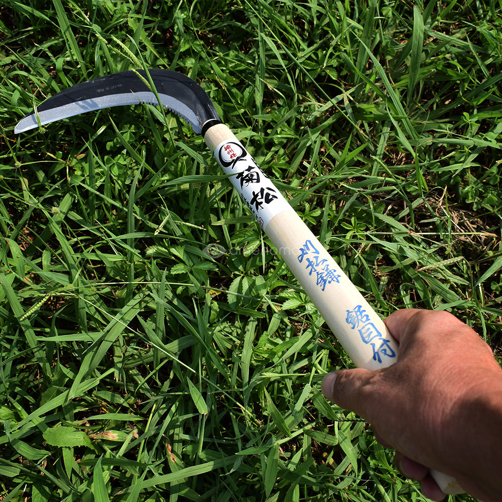 刈払鎌は横に振って草を刈る鎌です。刃のカーブ位置に鋸目を付け、草が引っ掛かり効率よく草刈りできます。 刃はHRC60度以上の硬度で全身焼入れ、さらにスキ仕上(研磨した刃をさらに凹状に削る事により草離れが良く切れ味を向上させる技法)で作りました。刃首を曲げてますので地面に沿って刈る事ができます。裏目鋸刃タイプで研ぎ直しが簡単です。
