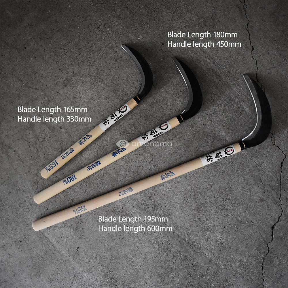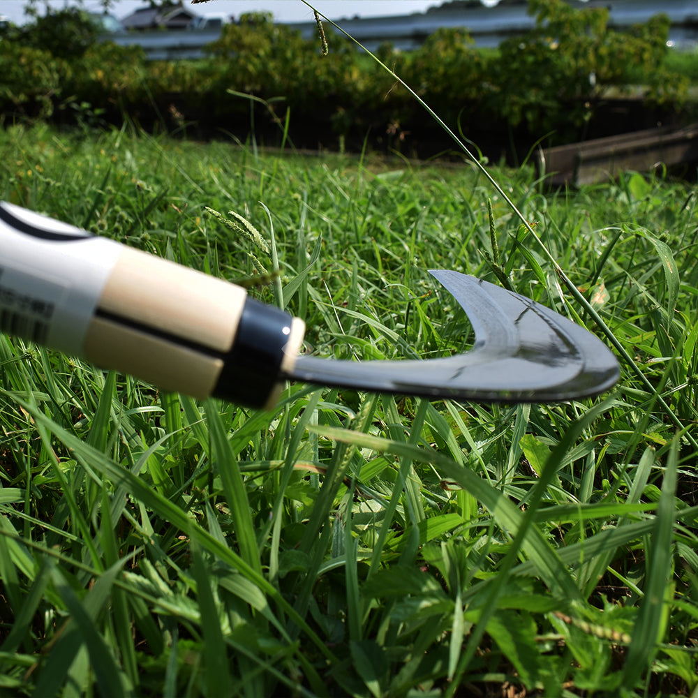 刈払鎌は伸びた雑草刈におすすめです。鋸目部分で草をロック、逃がさず草刈りできます。 165mmは片手持ちタイプ。中腰からしゃがんだ状態の作業におすすめです。